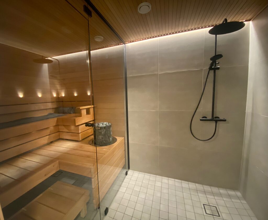 Jos pesuhuoneen puolella saunan seinän vieressä on poreamme tai suihku, niin niille pitää varata tilaa noin 900-1000 mm. Eli saunan puolelta 900-1000 mm voidaan käyttää Suorassa ja Pienessä L-lauteessa kiukaalle ja Suuressa L-lauteessa, U-lauteessa ja Vastakkaismallissa lauteelle.