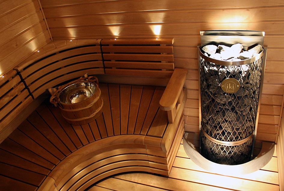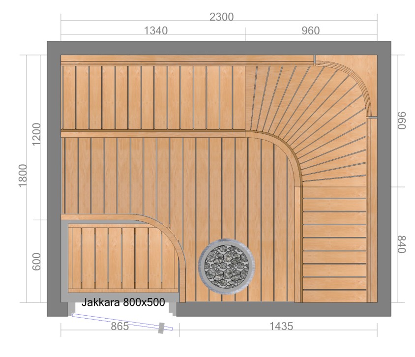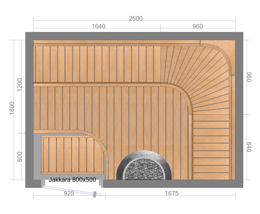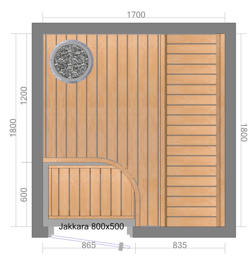 Kulmakiuas: Sauna, jonka mitat ovat 1800mm *1650 mm. Pyöreällä pilarikiukaalla L-mallinen laude jää kapeaksi pyöreällä kiukaalla, koska 6 kW:n pilarikiuas vaatii noin 550 mm tilaa käsinojan ulkoreunan ja oviseinän pinnan väliin. IKI Kulma 6 kW:n kiukaalla on kulmalaude kuitenkin mahdollista toteuttaa. Kulmakiuas voidaan asentaa suoraan paneeliseinää vasten ja näin tilan tarve on pienempi kuin pyöreällä mallilla. Tämä antaa tilaa luovalle suunnittelulle lauderatkaisuissa: Kulmakiuas on säteeltään vain 300 mm ja suojaetäisyys kiukaan etureunasta lauteeseen 100 mm. Kun suunnittelet saunasi pilarikiukaalla, pienessä tilassa kannattaa huomioida esim. IKI:n Kulma ja Seinä-mallin kiukaita. Oikea kiuasvalinta voi ratkaista vaikeimmatkin pulmat suunnittelussa!