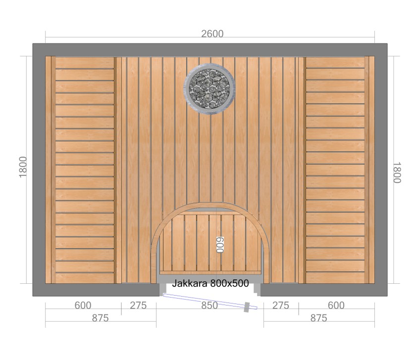 Seinäkiuas: Alakuvissa on kuvattuna vastakkain istuttavat lauteet sekä iso L-mallin laude. Leveydeltään tilat ovat sopivat valitulle laudemallille, mutta syvyysmitaltaan liian pienet pyöreälle pilarikiukaalle. Vastakkaisissa lauteissa pyöreä kiuas tulee vastaan melkein heti nousuaukon jälkeen ja L-lauteessa se on liian lähellä kulkuväylää. Parempi ratkaisu näissä molemmissa vaihtoehdoissa on IKI Seinä - kiuas, joka on 540 mm leveä mutta vain 300 mm syvä. IKI Seinä-sähkökiukaat voidaan asentaa suoraan saunan paneeliseinää vasten. Suojaetäisyys kiukaan etureunasta lauteeseen on vain 100 mm.