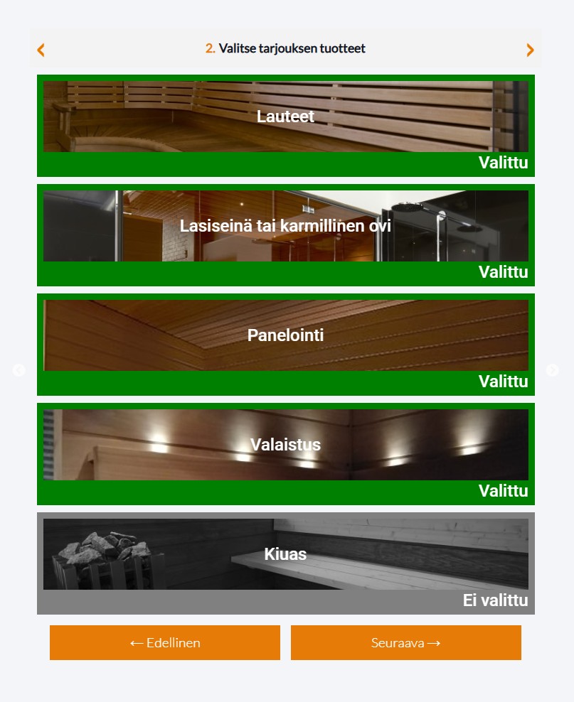 Ohjelma antaa ehdotuksia aina edellisten antamiesi arvojen mukaan, joten vaihtoehdot kasvavat esim. suurempien saunojen kohdalla erilaisten laudemallien suhteen.