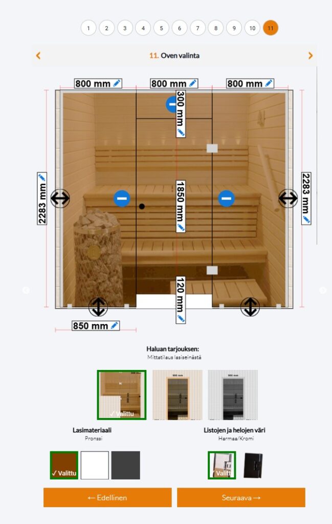 Seuraavaksi on aika syöttää ohjelmaan saunasi mitat millimetreinä. Mittaaminen kannattaa tehdä aina huolella ja tähän saat myös apua ammattilaisiltamme.