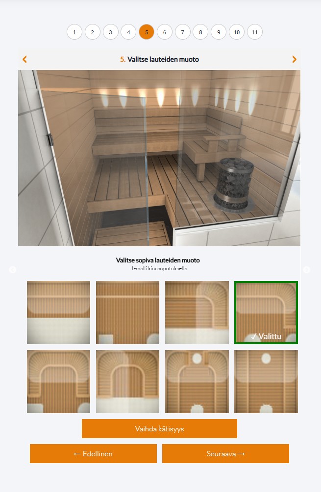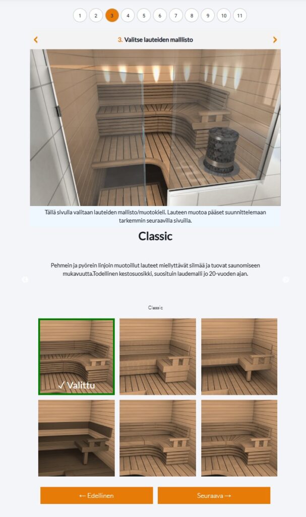 Tästä osiosta valitset lauteen muodon. Ohjelma ehdottaa sopivat laudemallit kyseisille mitoille. Valitse sopiva lauteen muoto ja paina Seuraava-nappi.