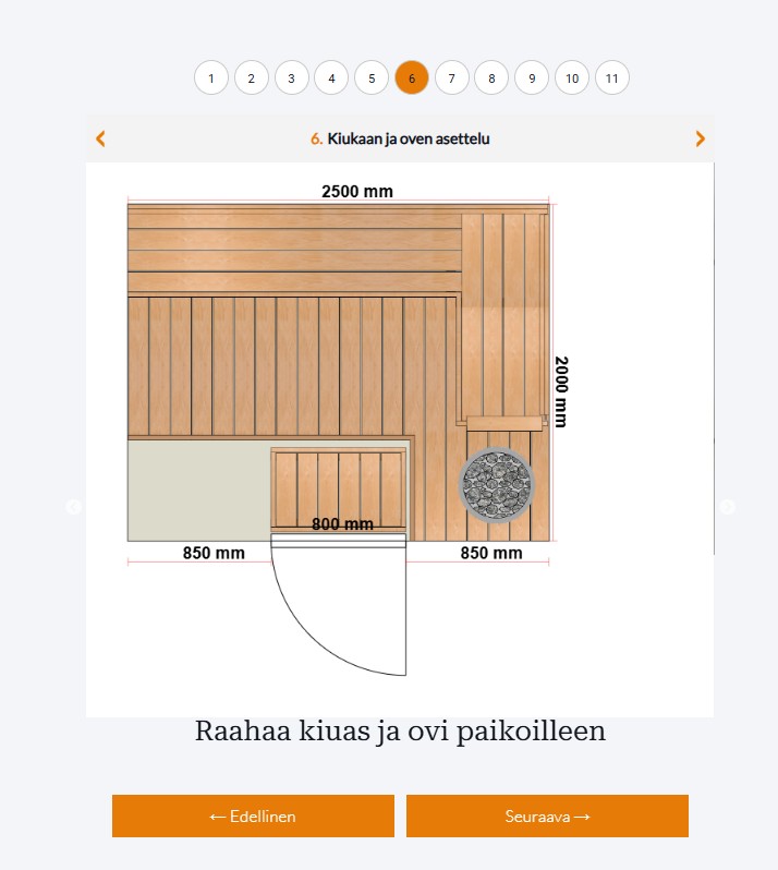 Työkalulla pystyy yksinkertaisia askeleita ja opastusta noudattaen luomaan oman unelmiensa saunan. Saat esikatselussa valmiin 3D-kuvan saunastasi ja lähetettyäsi suunnitelmasi meille napin painalluksella, pystyy myyjämme antamaan sinulle tarjouksen suunnittelemastasi saunasta.