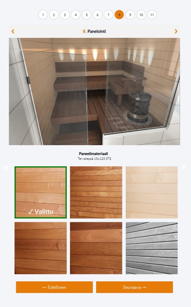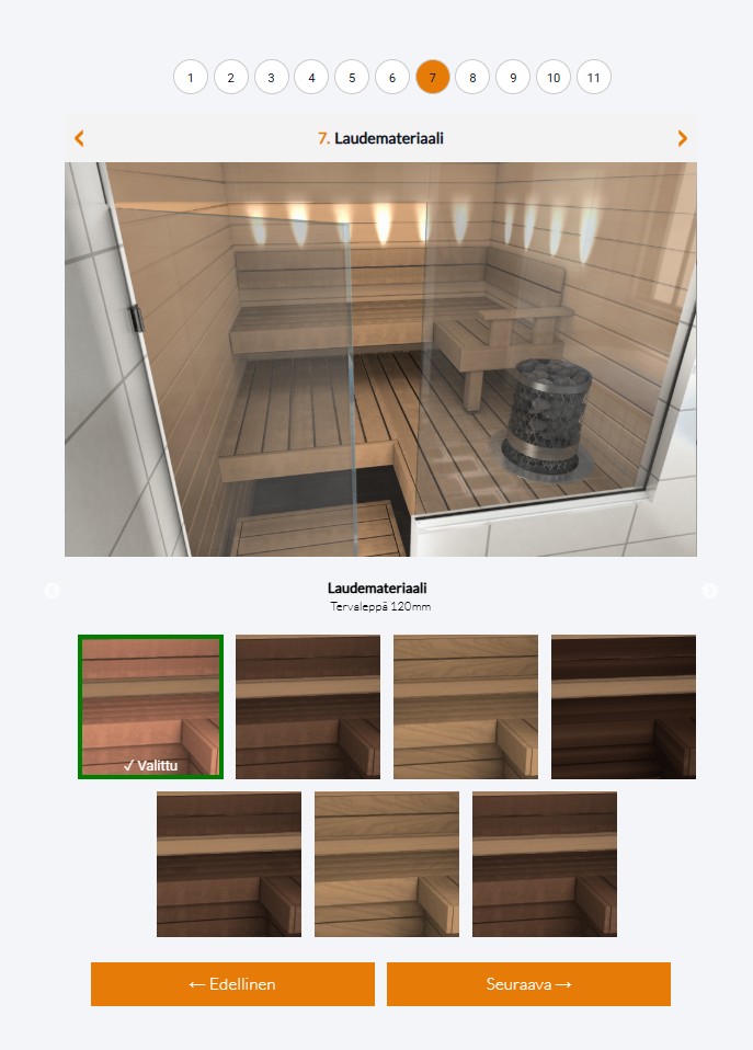 Seuraavaksi on aika valita lauteesi materiaali. Eri mallistoilla voi olla 4-7 erilaista materiaalia. Samalla kun valitset itsellesi materiaali, se vaihtuu myös 3D-kuvaan.