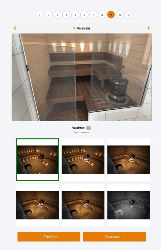 Seuraavaksi on aika valita saunan valaistus. Tämä onnistuu helposti valitsemalla erilaisista vaihtoehdoistamme haluttua vaihtoehtoa klikkaamalla. Samalla esikatselukuva päivittyy aina valitsemasi valaistusvaihtoehdon mukaan. Kokeile jälleen rohkeasti eri vaihtoehtoja.