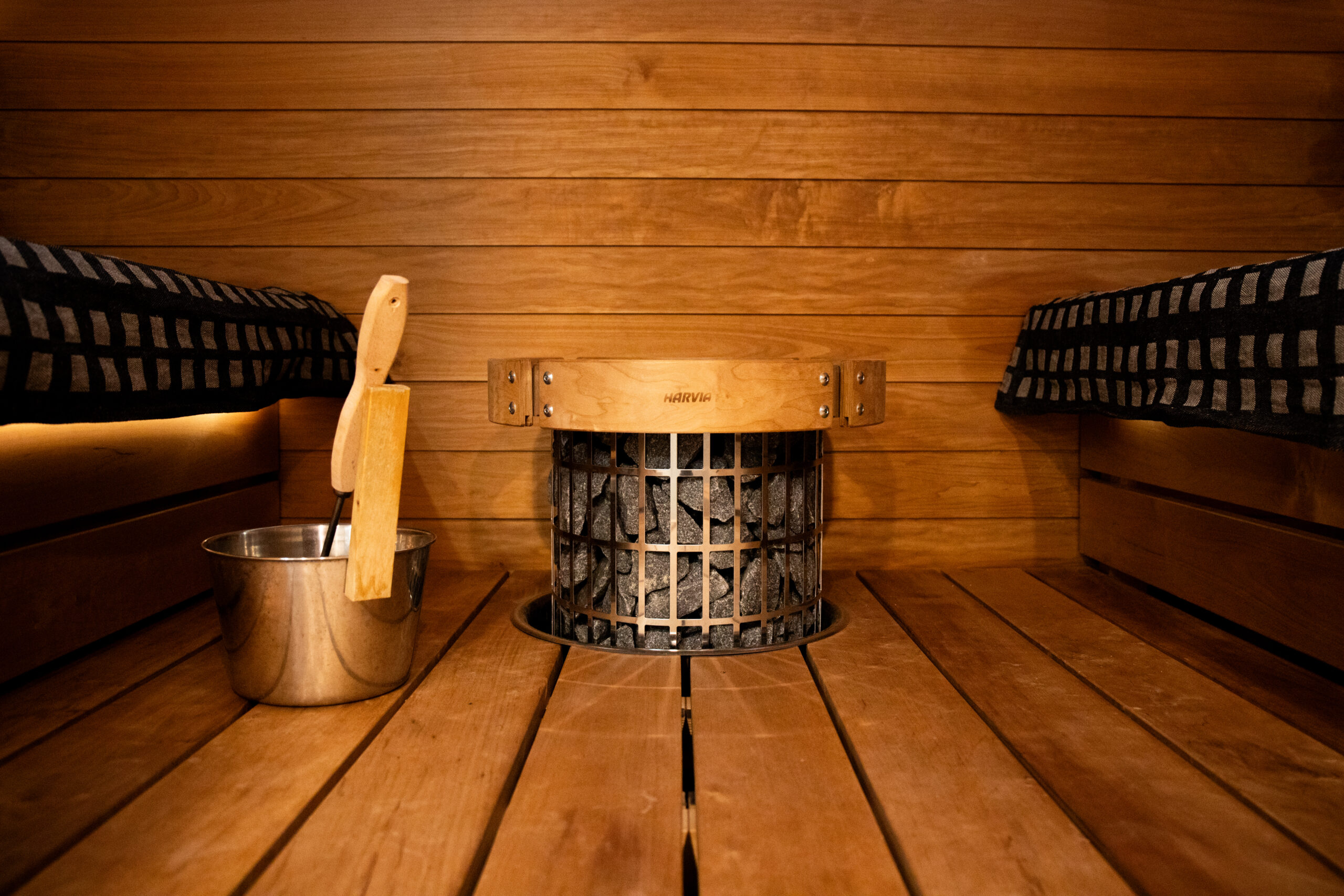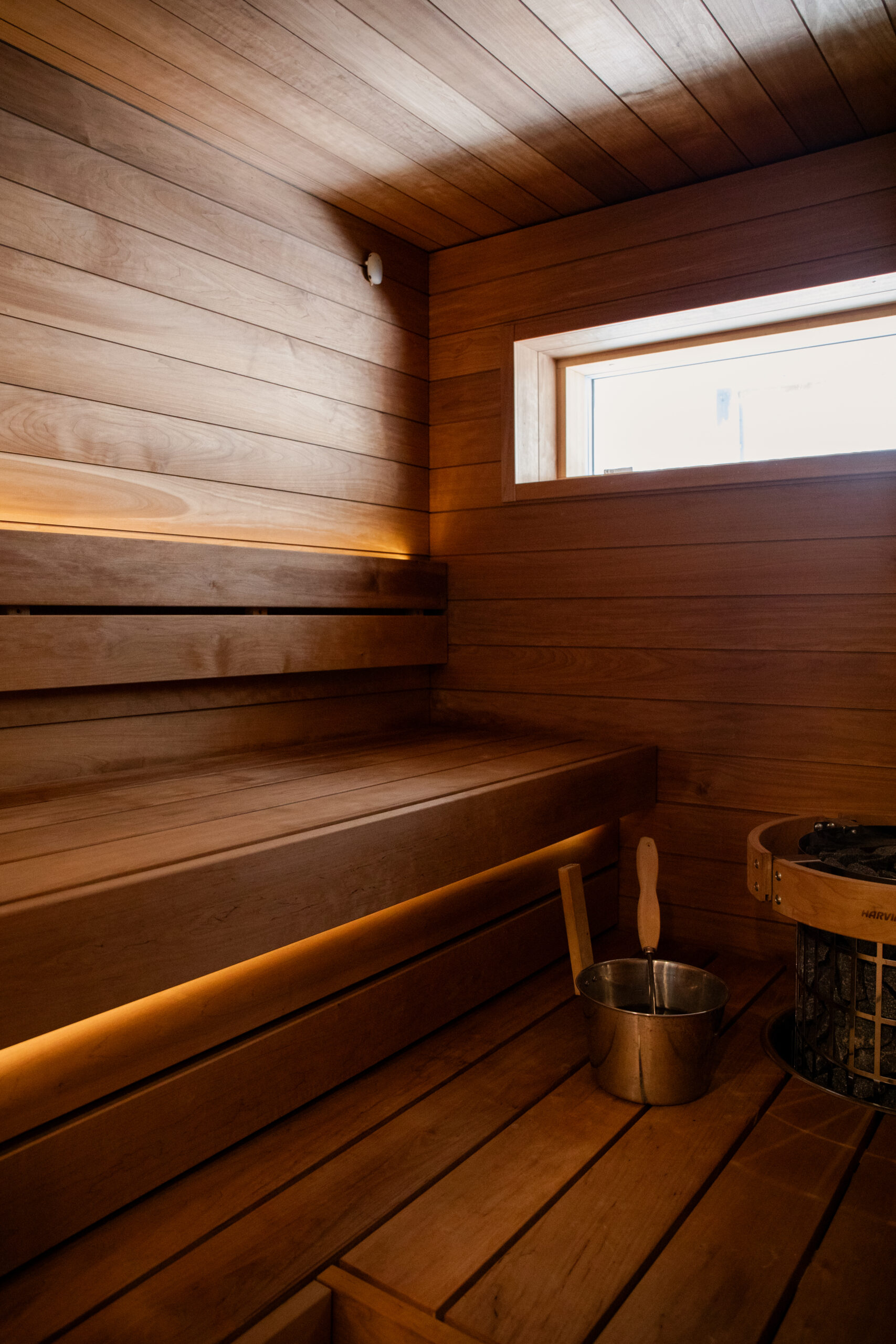 Kiukaana kohteessa on Harvia Cilindro 10,8 kW. Kokonaisuus muodostaa selkeän ja toimivan saunaratkaisun, jossa materiaalit, valaistus ja lasipinnat tukevat modernia ilmettä.