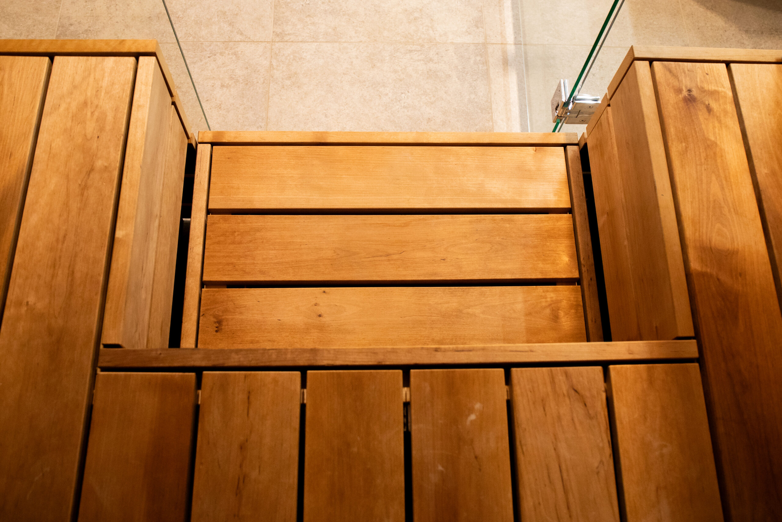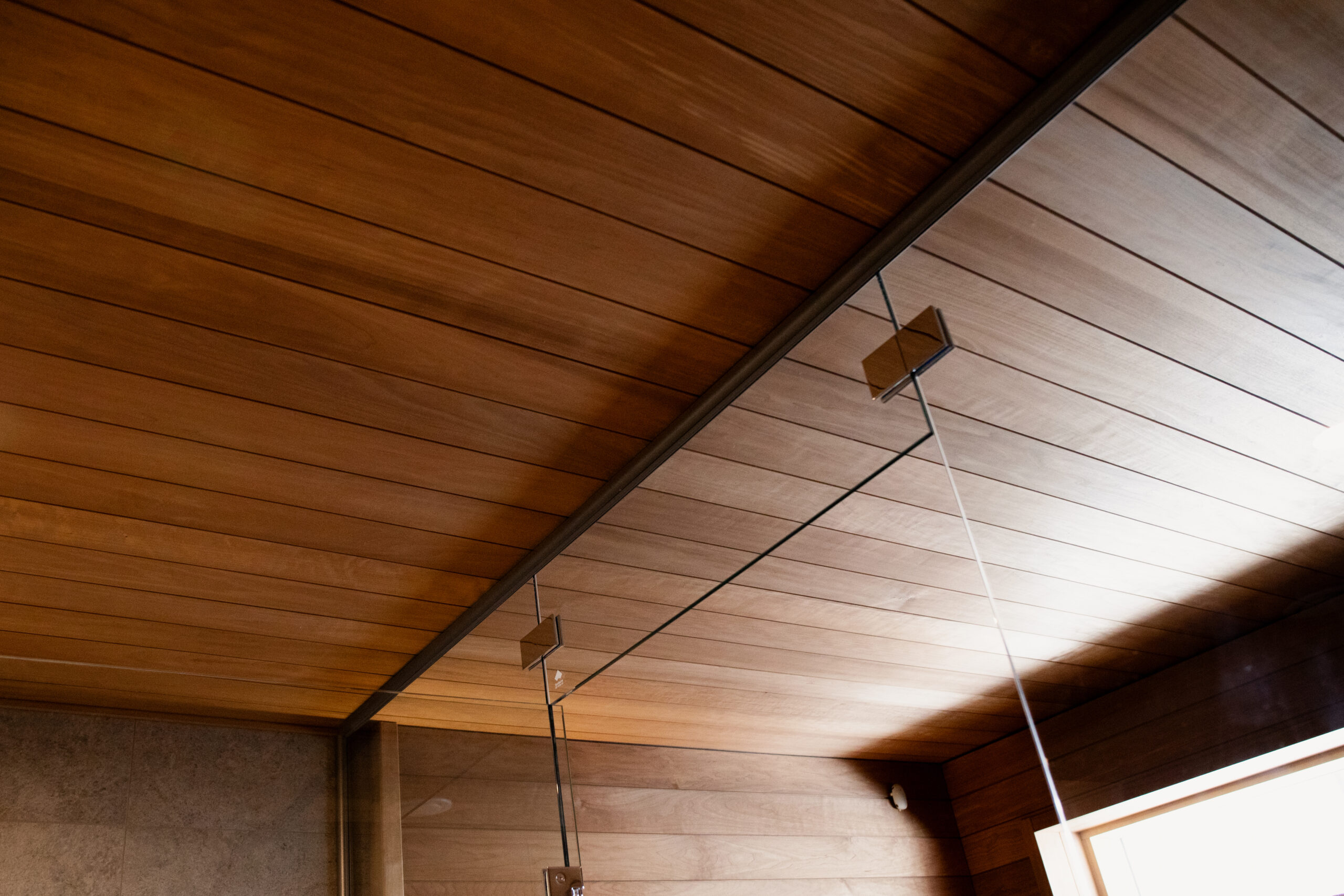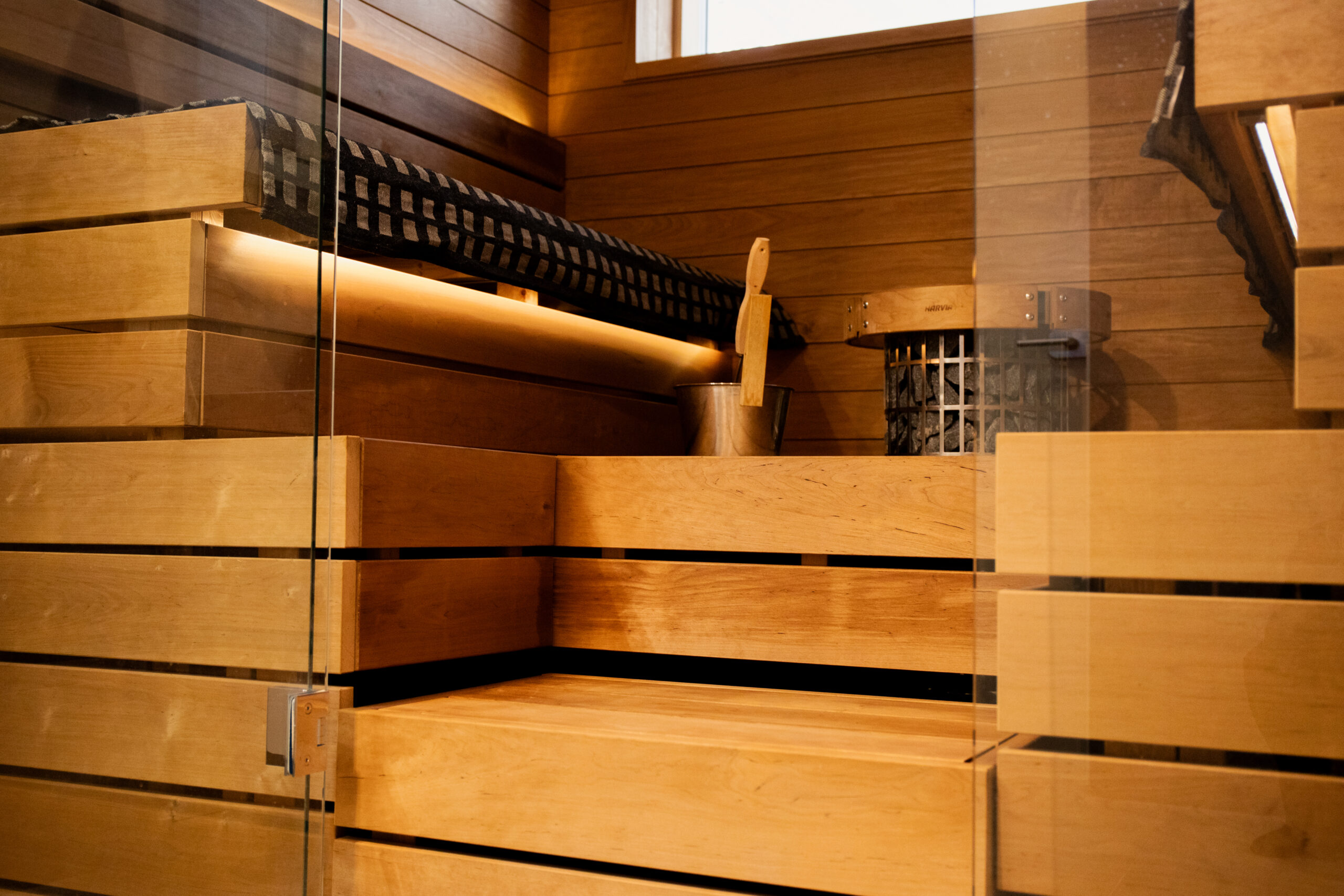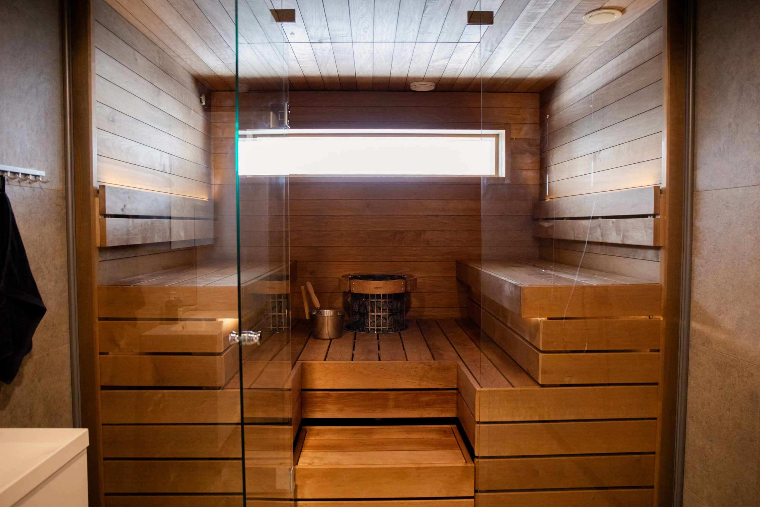 Saunan valaistus on toteutettu Cariittin Linear -valaisimella, joka tuo tilaan pehmeää ja tasapainoista valoa. Saunan ja pesuhuoneen välissä on kirkas lasiseinä, joka avartaa tilaa ja yhdistää tilat selkeästi toisiinsa.