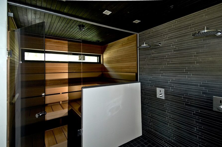 Kylpyhuoneessa ja pesutiloissa käytettävä lasiseinä ei ole vain tilanjakaja, se yhdistää saunan, pesuhuoneen ja pukeutumistilan yhtenäiseksi kokonaisuudeksi, Kotikylpyläksi.