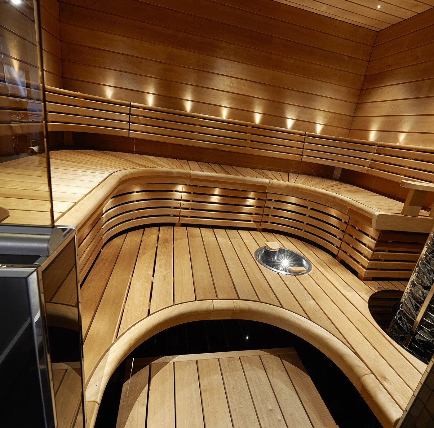 Lauteiden selkänojien ja välitilanritilöiden muotopuristekaaret jatkavat pyöreää muotokieltä myös lauteen kulmissa. Laudemalli sopii niin pieniin kuin isompiinkin saunatiloihin.