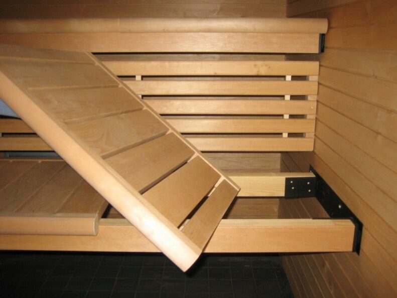 Ylä- ja alalauteen välisen ritilän ansiosta lastenkin on turvallista saunoa. Materiaali on sama kuin ralleissa.